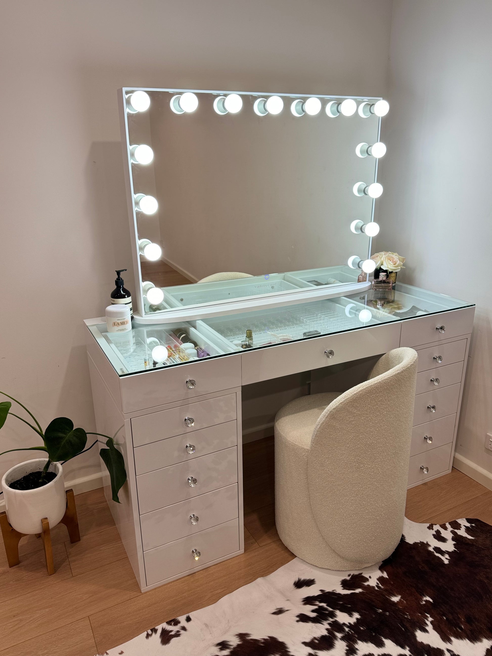 - 13 Drawers Clear Glass Top Beauty Station + Frameless Hollywood Makeup Mirror with Lights