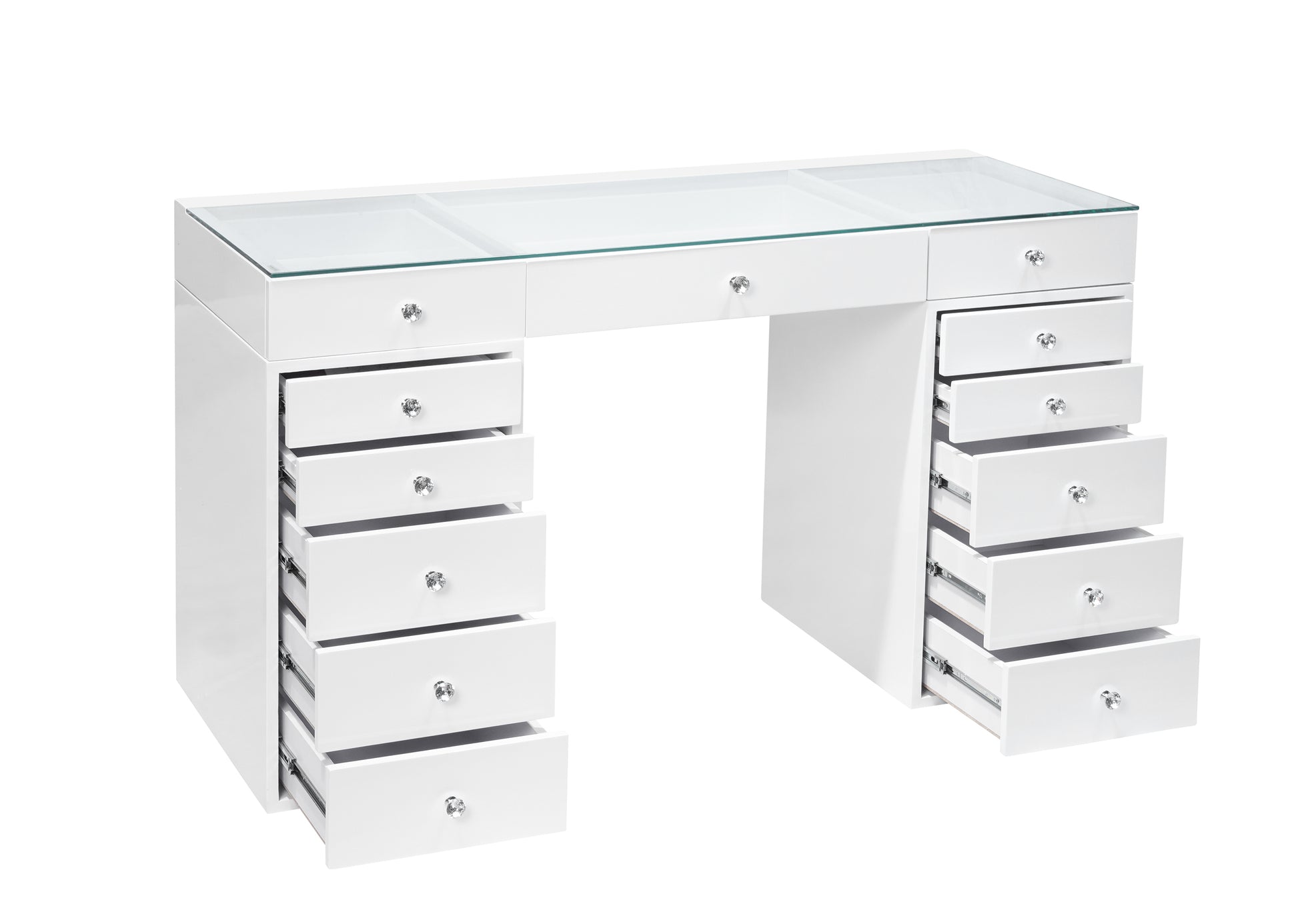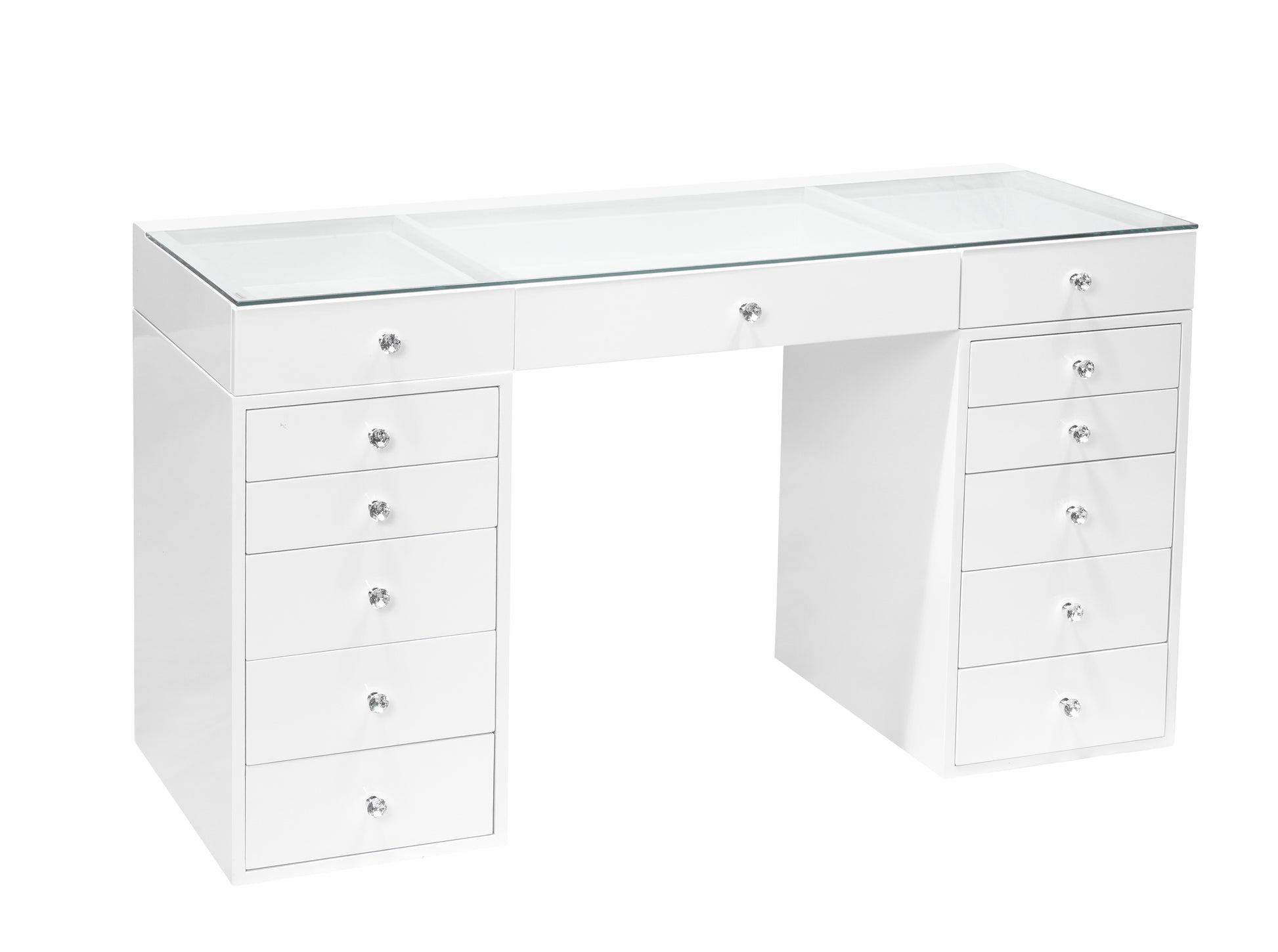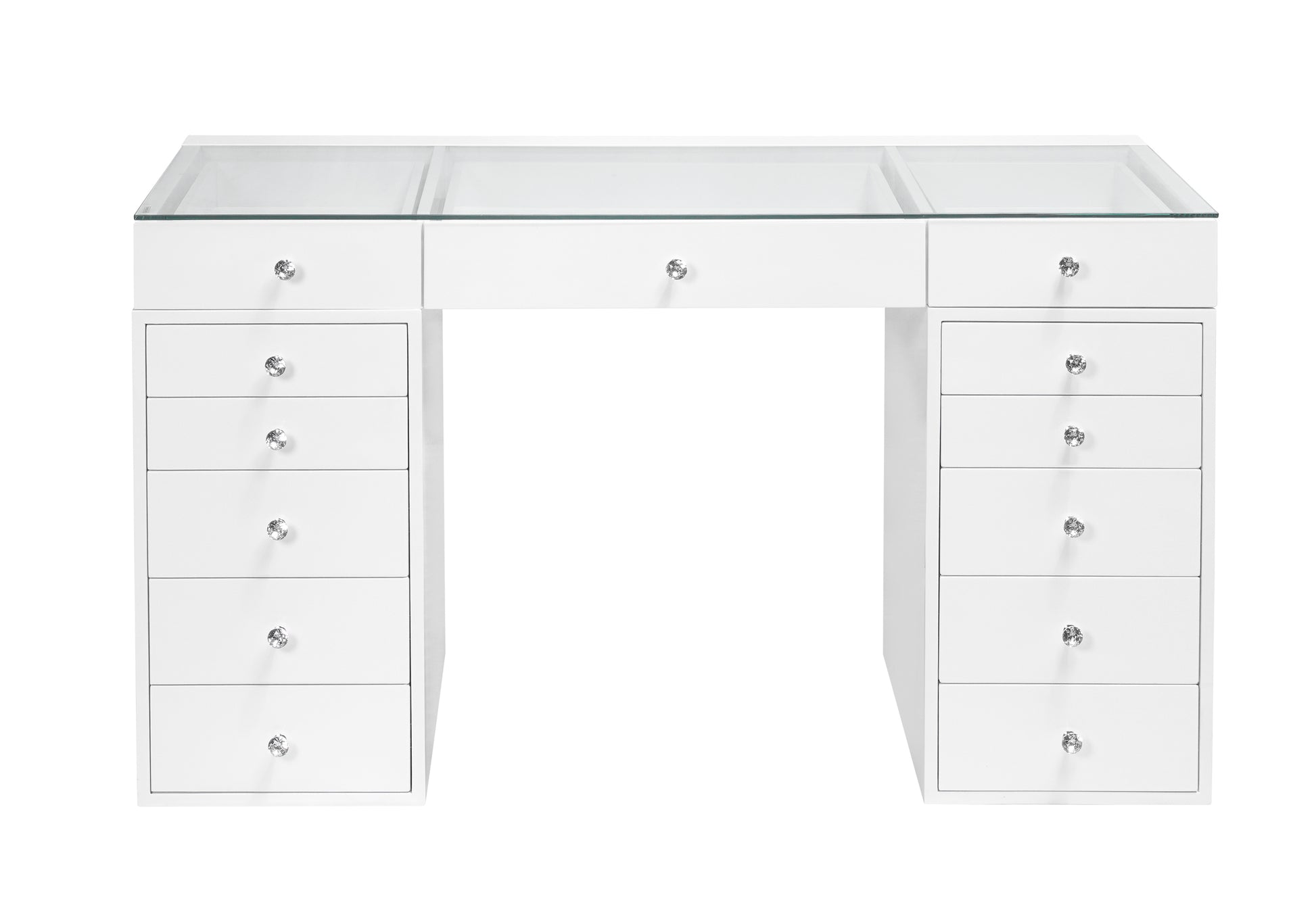 Hollywood Makeup Mirror + See through Vanity Table features a clear glass top and three pull out drawers that simply looks stunning + 5 Drawers on both side of the table with diamond handles. Perfect table to display all of your makeup and accessories right where you want them!