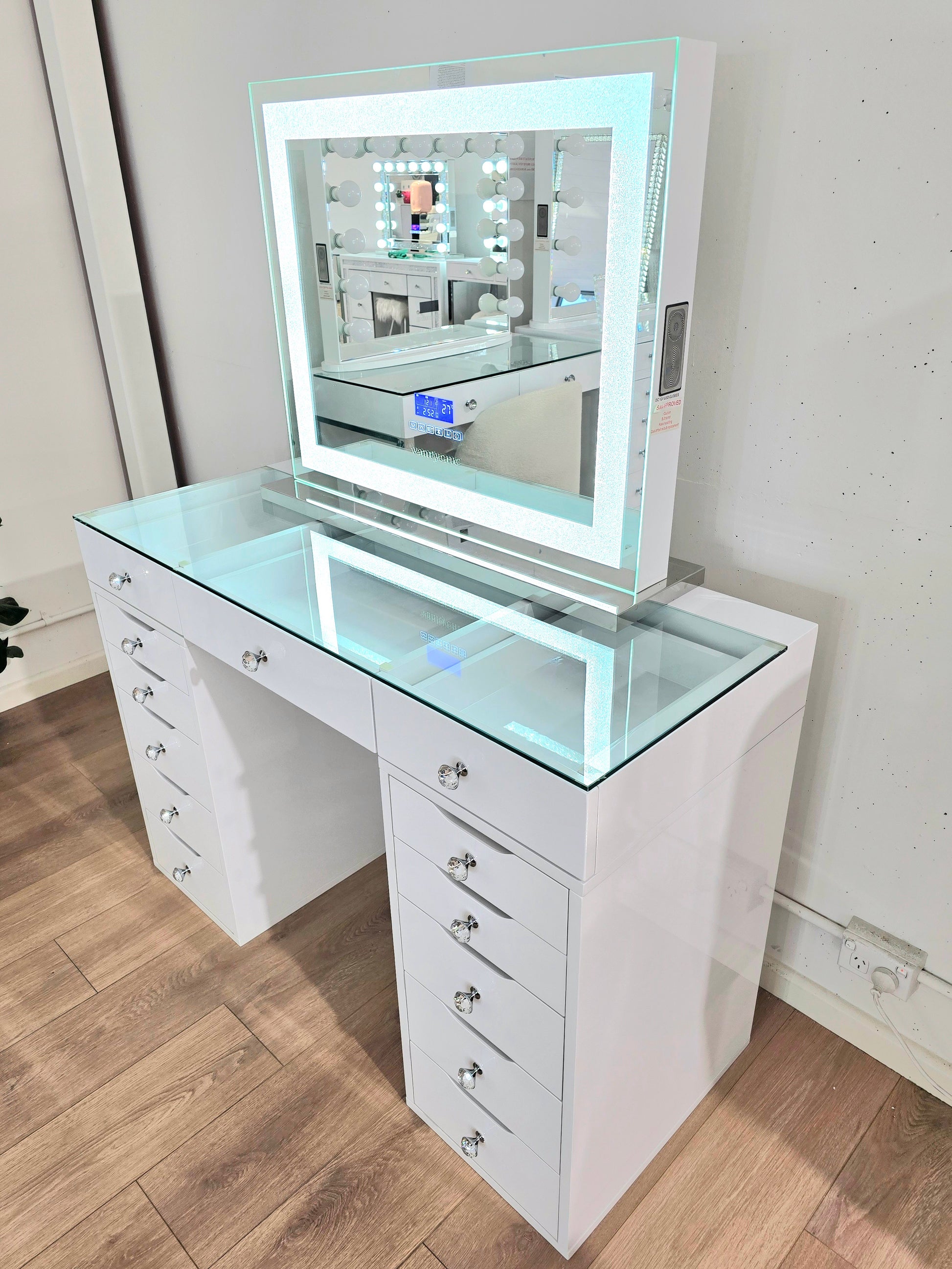 - 13 Drawers Clear Glass Top Beauty Station + Large Crystal Hollywood Makeup Mirror with Lights